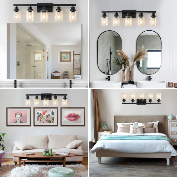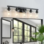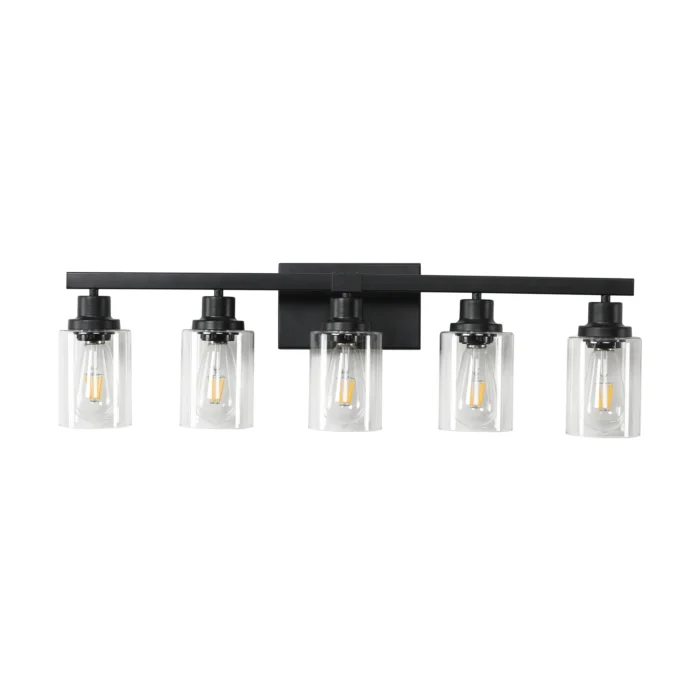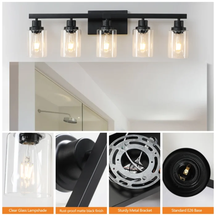 Be the first to review “Modern Industrial Bathroom Vanity Light, Metal Finish 5-Light Wall Sconce, Clear Glass Lampshades, Indoor Decorative Lighting” Cancel reply