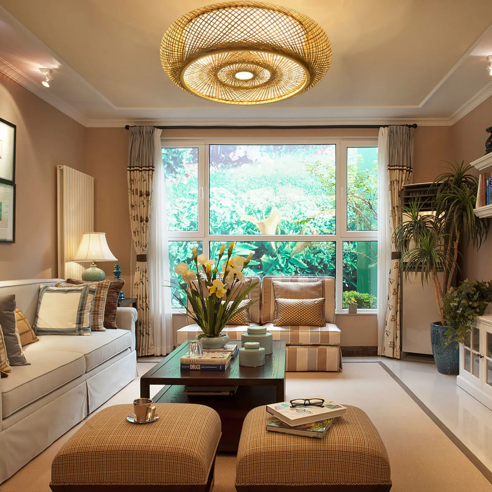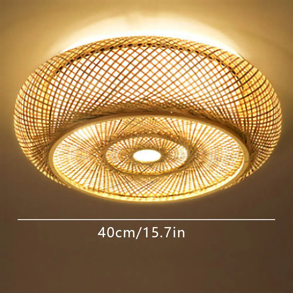 40cm Diameter Round Bamboo Wicker Rattan Lantern Pendant Lighting Fixture with Hanging Ceiling Mount